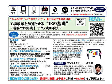 IEについてこれから勉強したい、「なんとなく」知っているが、現場で実際に使えない。そういった方に向け、本セミナーではIEの基礎から、現場で明日からでも実践可能なテクノ式IE手法まで詳しくお話します。