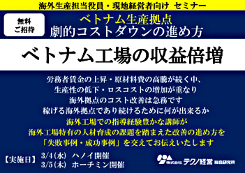 労務者賃金の上昇・原材料費の高騰が続く中、生産性の低下・ロスコストの増加が重なり海外拠点のコスト改善は急務です。稼げる海外拠点であり続けるために何が出来るか。海外工場での指導経験豊かな講師が海外工場特有の人材育成の課題を踏まえた改善の進め方を「失敗事例・成功事例」を交えてお伝えいたします。