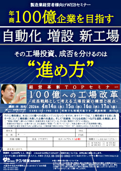 その工場投資は、本当に100億への成長エンジンになっていますか。本セミナーでは、「工場投資をする前に為すべきこと」「工場投資に失敗した企業の共通点」、そして「投資後、さらなる成長につなげる道筋」を解説します。
