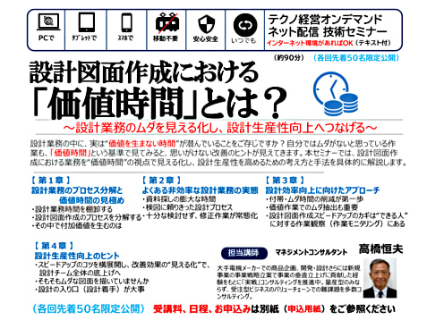 設計業務の中に、実は“価値を生まない時間”が潜んでいることをご存じですか?自分ではムダがないと思っている作業も、「価値時間」という基準で見てみると、思いがけない改善のヒントが見えてきます。本セミナーでは、設計図面作成における業務を“価値時間”の視点で見える化し、設計生産性を高めるための考え方と手法を具体的に解説します。