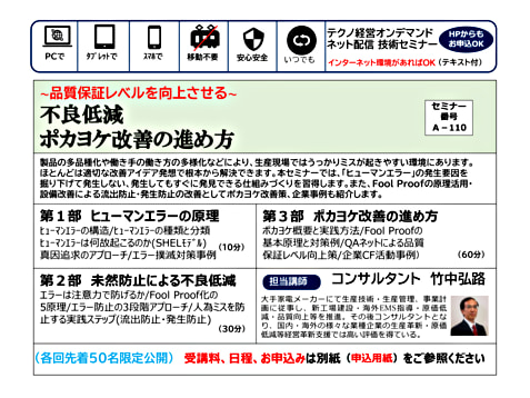 製品の多品種化や働き手の働き方の多様化などにより、生産現場ではうっかりミスが起きやすい環境にあります。ほとんどは適切な改善アイデア発想で根本から解決できます。本セミナーでは、「ヒューマンエラー」の発生要因を掘り下げて発生しない、発生してもすぐに発見できる仕組みづくりを習得します。また、Fool Proofの原理活用・設備改善による流出防止・発生防止の改善としてポカヨケ改善策、企業事例も紹介します。
