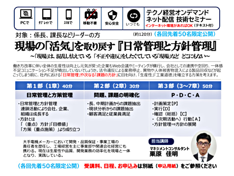 働き方改革に伴い全体の生産性は向上し元気が戻った企業もWeb会議やミーティングが横行し、会社としての連携や空回り、一体感不足コミュニケーション不足が噴出していないでしょうか。法令違反による業務停止、異物や人体被害物混入による製品回収などが起こってしまう前に、社内における「日常管理」や次なる「課題の方針」に目を向け、「生産性」「工業道徳」を確立する方策を考えます。
