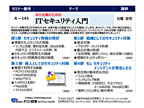 サイバー攻撃の手口が巧妙化する中、企業や個人が直面するリスクも増加しています。本セミナーでは、IPA(独立行政法人 情報処理推進機構)が発表した「情報セキュリティ10大脅威 2025」をもとに、ランサムウェア、DDoS攻撃、内部不正、ビジネスメール詐欺などの最新の脅威とその対策を解説。脅威への対策を学び、自社や自身の情報を守りましょう!
