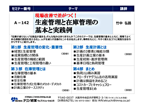 「在庫が減らない」「仕掛品が溜まる」そんな悩みはありませんか?このセミナーでは、生産管理の基本とともに、現場でよくある課題の原因を見える化し、ムダを減らす改善のヒントをお伝えします。事例をもとに、今すぐ使えるコツと実践方法をわかりやすくご紹介します。
